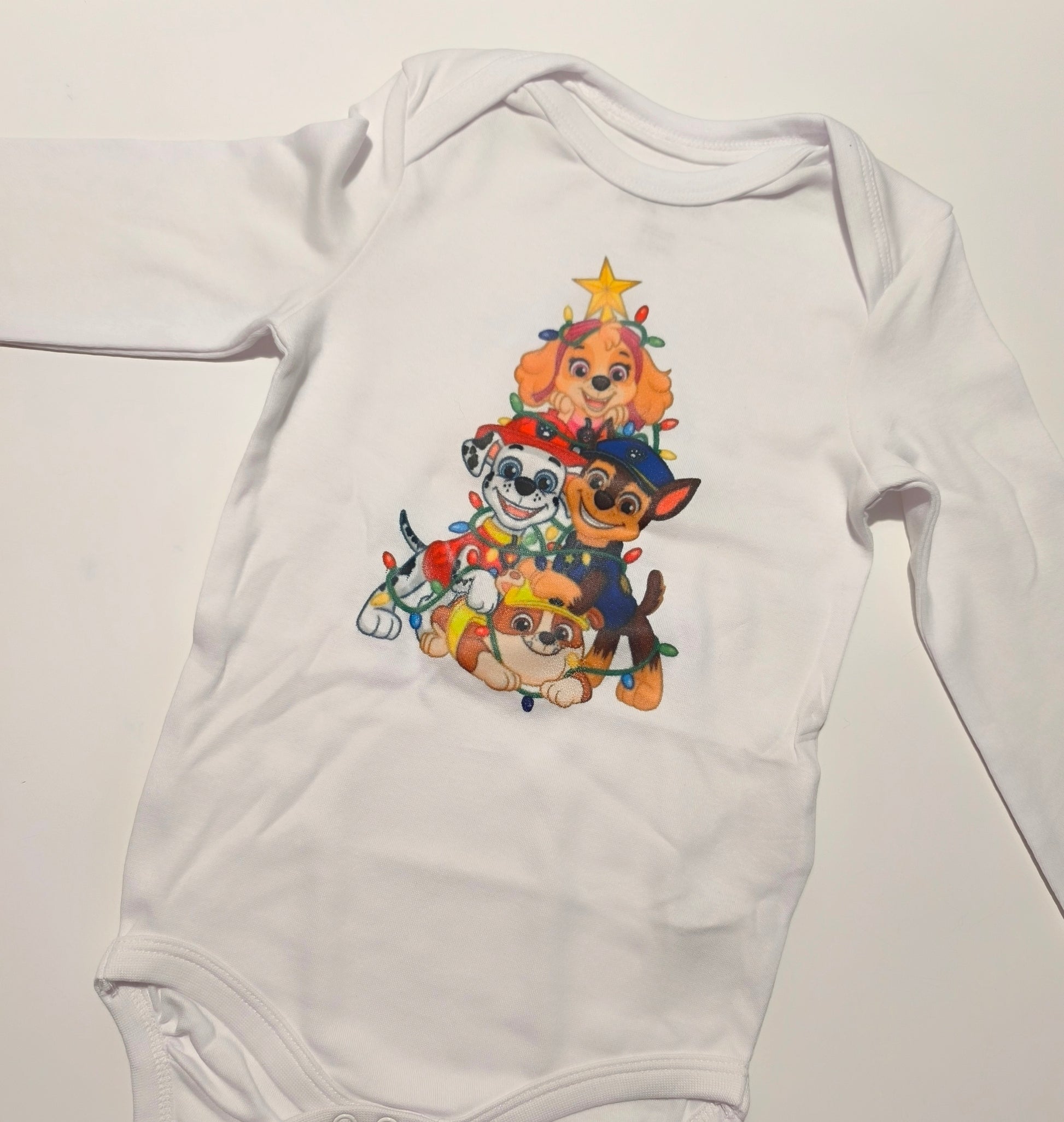 Praznični bodi z motivom Tačk na patrulji v obliki božičnega drevesca — popoln za male oboževalce in praznično veselje!