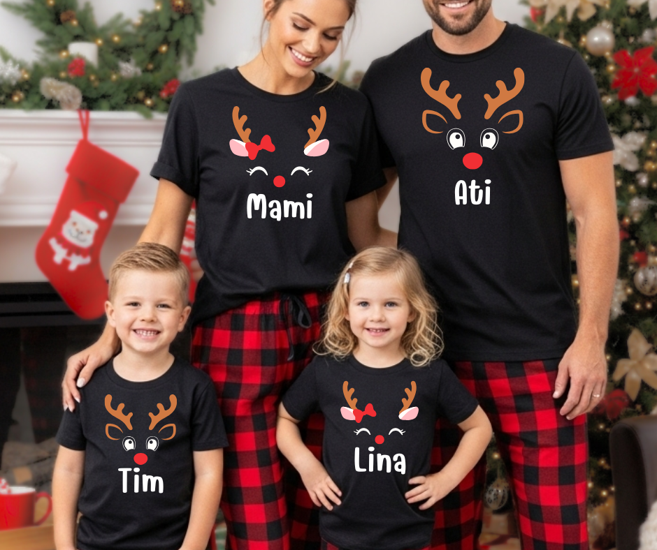 Z igrivim jelenčkovim motivom, rdečim nosem in možnostjo dodajanja vaših imen, bodo te majice popolna izbira za družinsko božično fotografiranje, praznično večerjo ali pod božično jelko.
