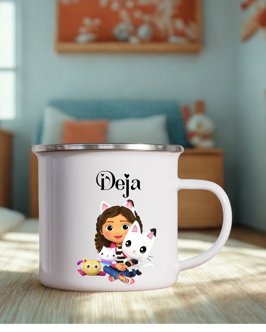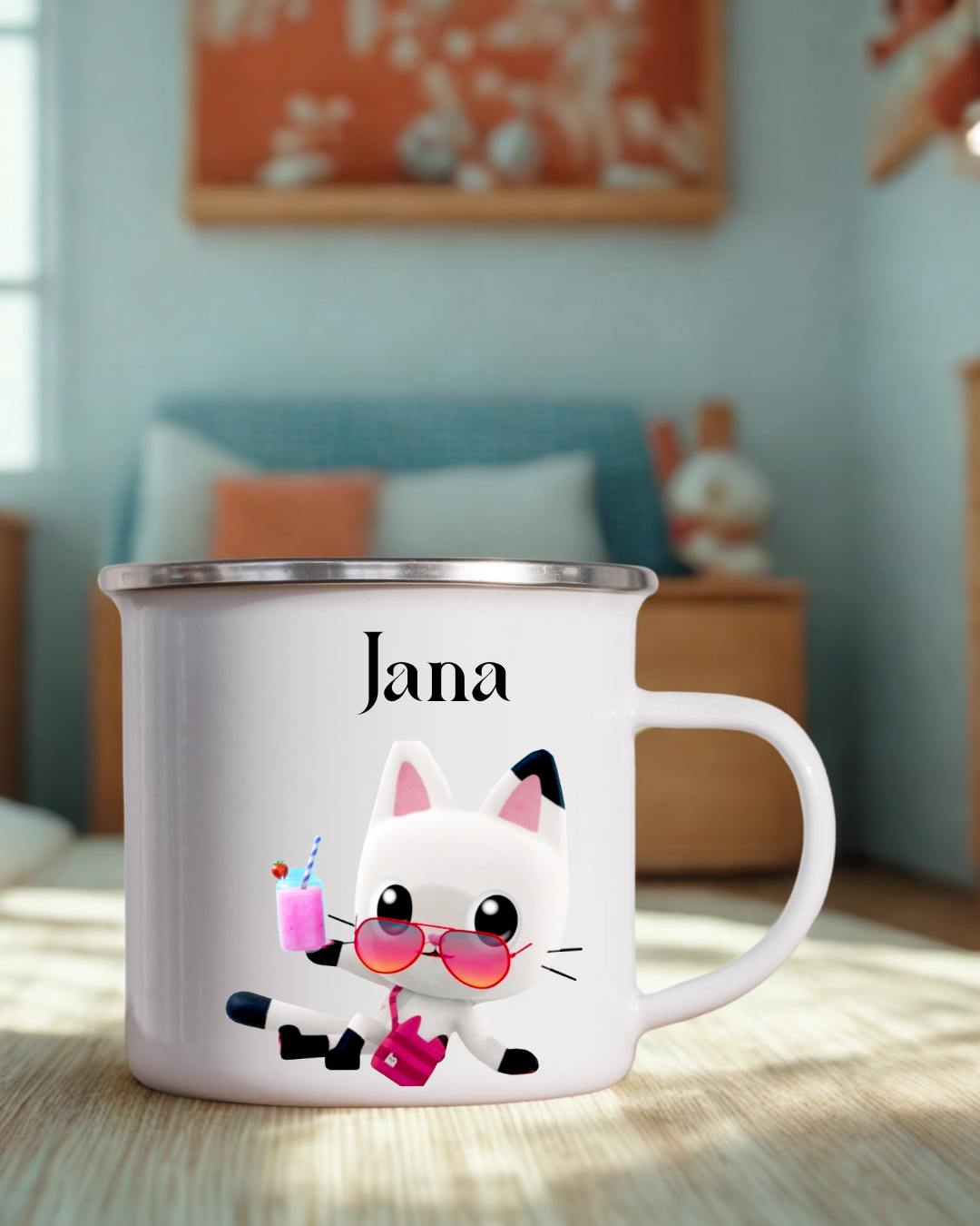 Ta emajlirana skodelica je popolna za male sanjače, ki obožujejo risanko in bi najraje vsak dan preživeli v mavrični hiši polni mačk.