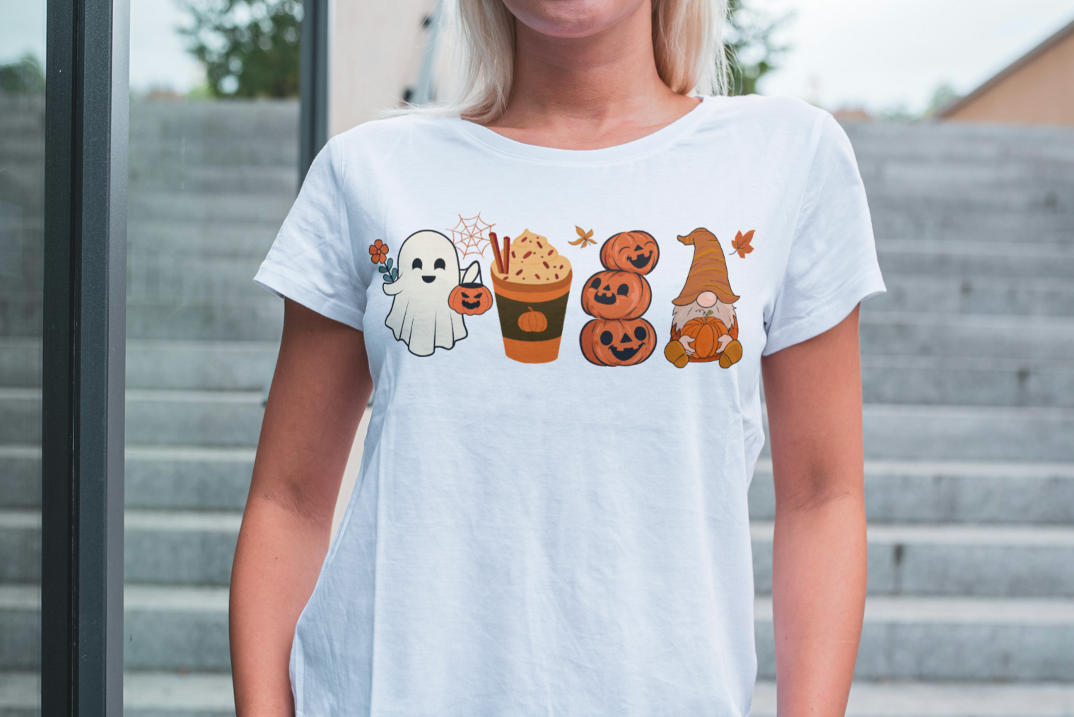 Na majici so razporejeni štirje Halloween in jesenski simboli, ki kar kličejo po bučnih zabavah in sladki norčavosti.