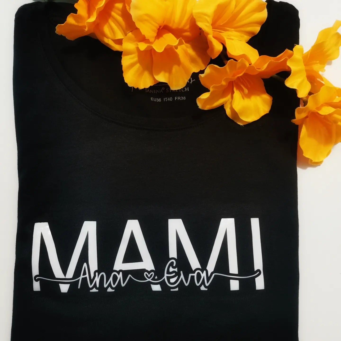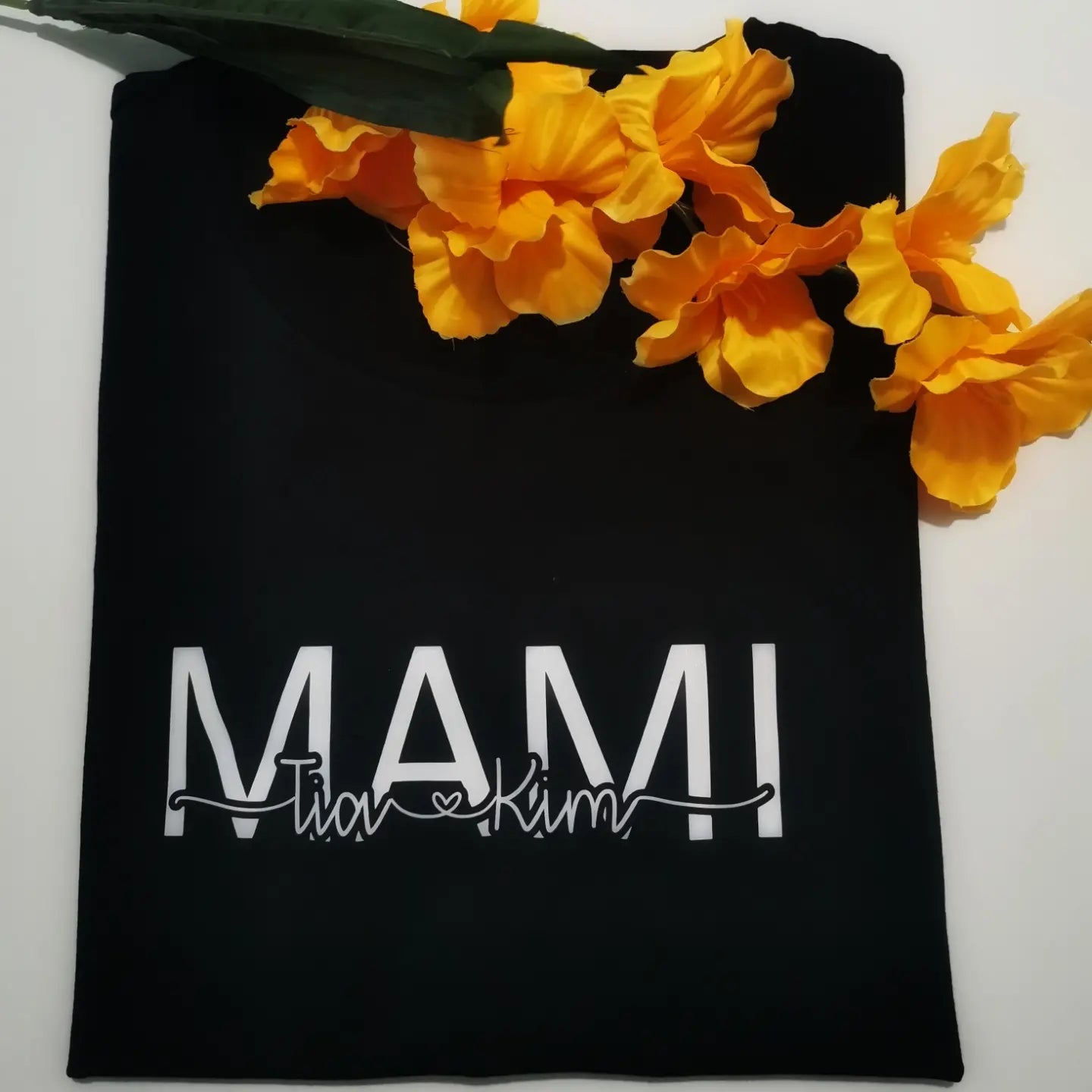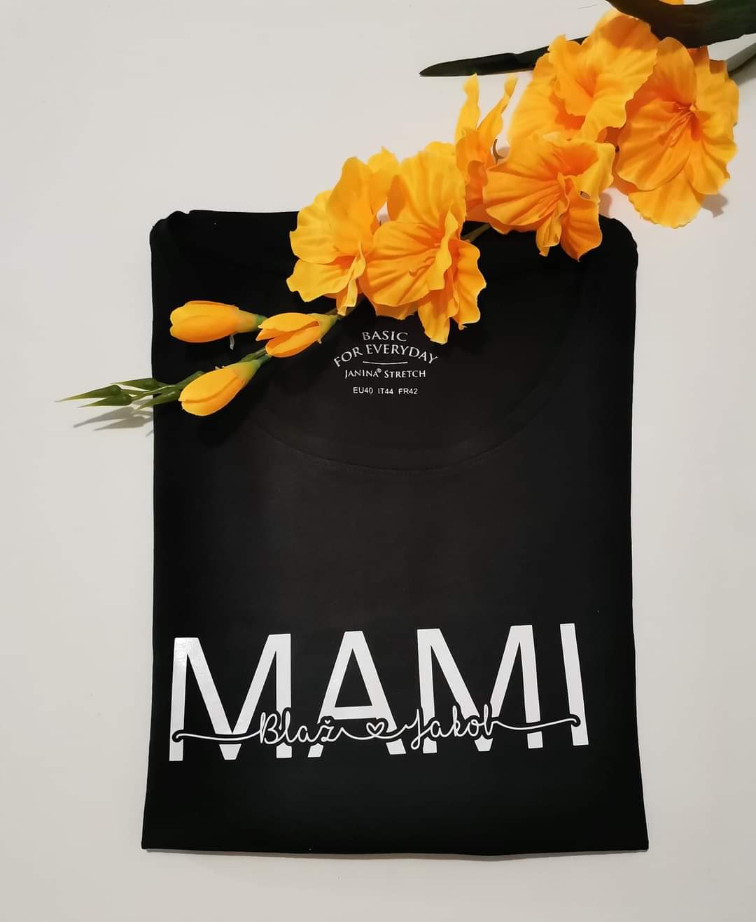 Podari ali si podari to čudovito majico z velikim napisom MAMI, ki ga v elegantni liniji prepletajo imena tvojih otrok.