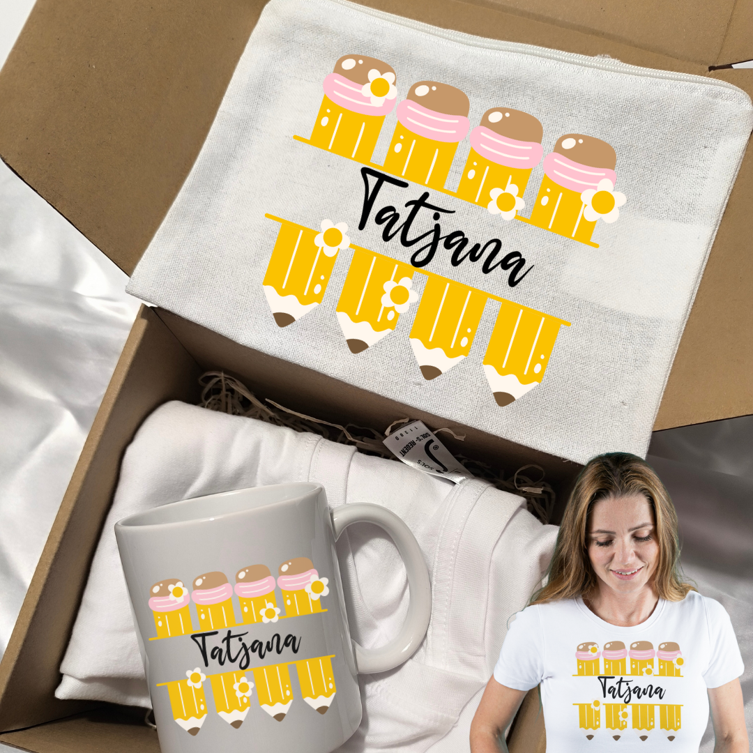 Paketek za vzgojiteljico ali učiteljico z motivom svinčnikov in njenega imena💛