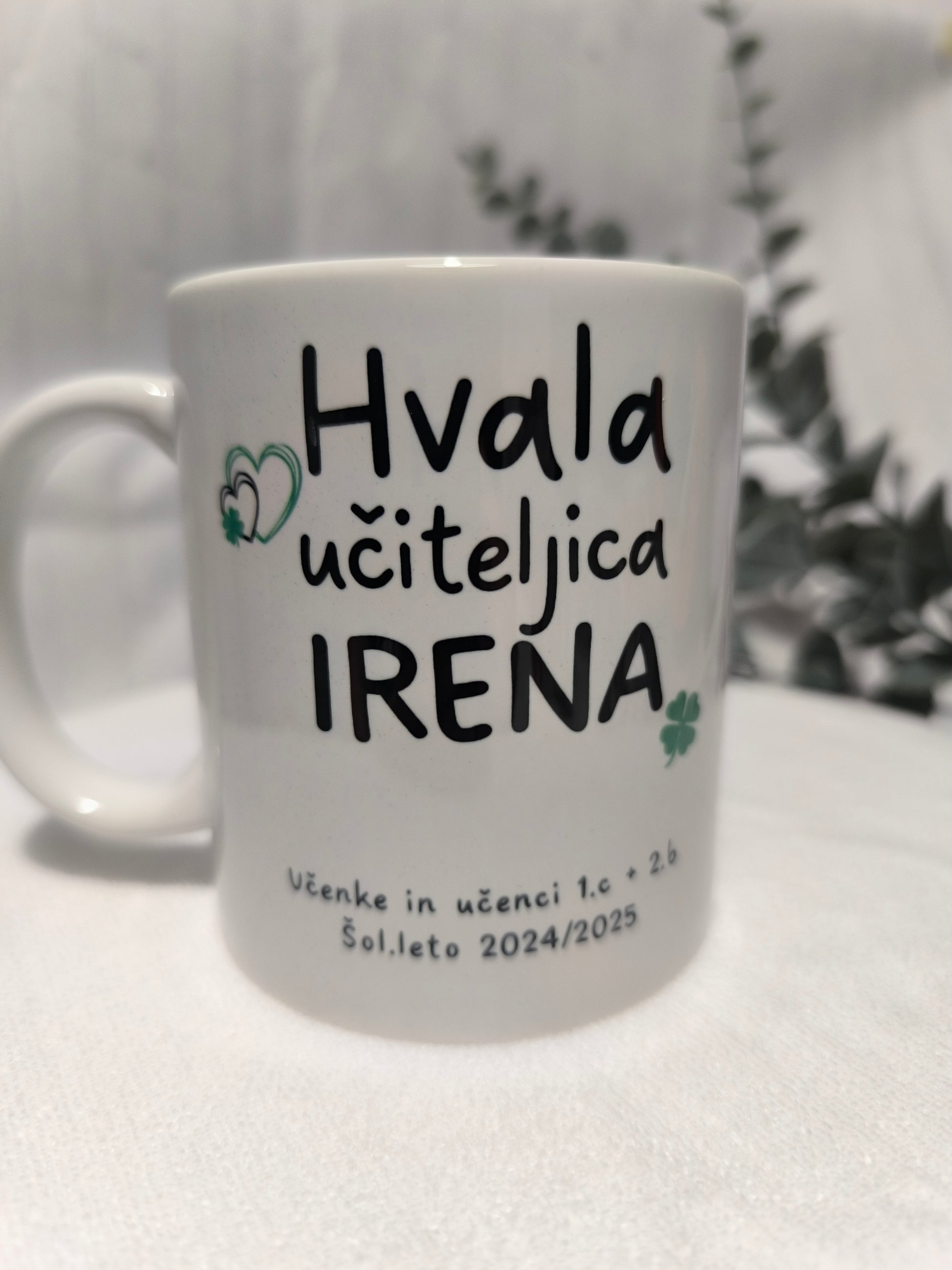 Iščeš posebno in srčno darilo za učiteljico? Naša personalizirana skodelica s posvetilom "Hvala, učiteljica [ime]" in imenom otroka ali razreda spodaj, je popolno darilo ob koncu šolskega leta, dnevu učiteljev ali kar tako – za zahvalo iz srca.